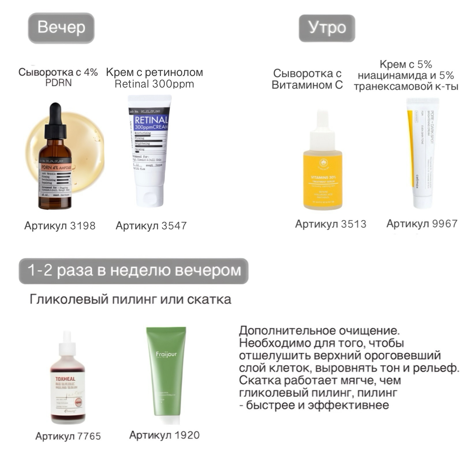 Если Вы не используете в уходе ретинол, сочетать активы можно следующим образом: