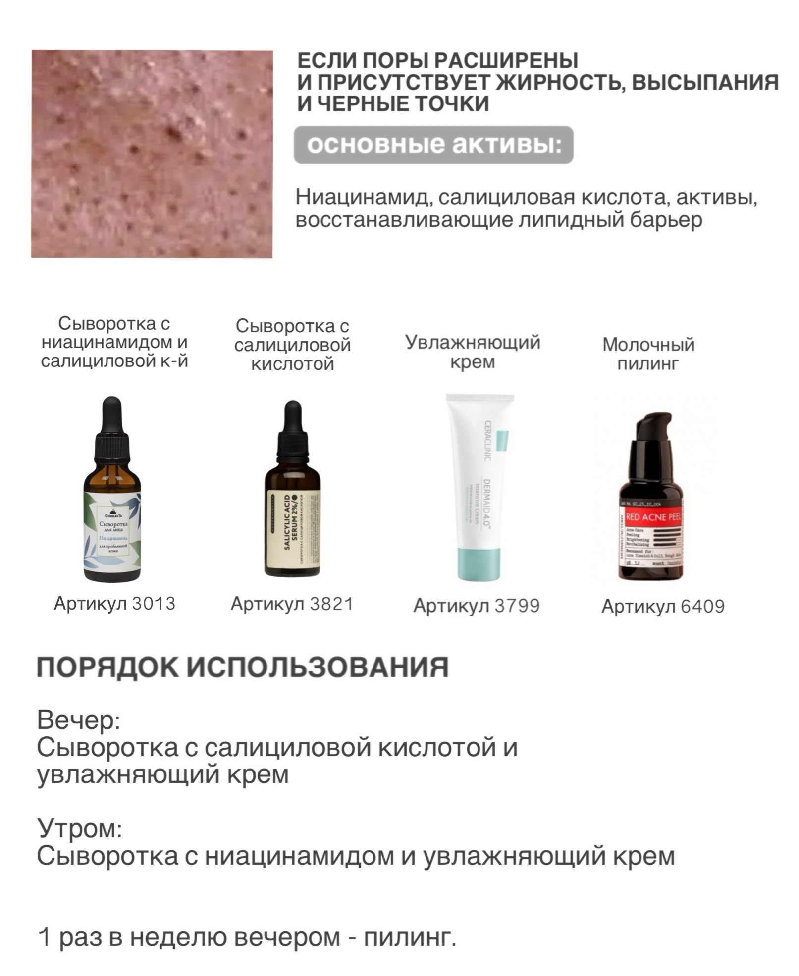 Если поры визуально кажутся шире в следствие того, что кожа потеряла упругость и стала дряблой, тогда основными активами будут ретинол, пептиды, ниацинамид и также кислотые пилинги.