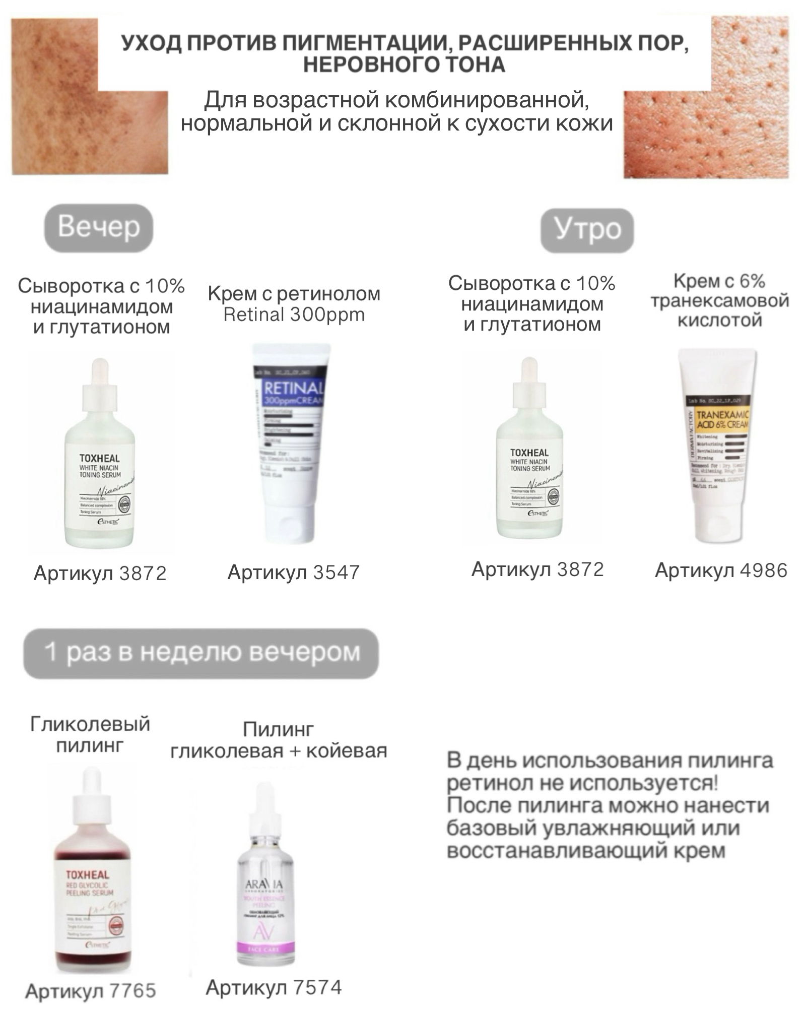 Одно из наиболее эффективных сочетаний, одновременно уменьшающих пигментацию и расширенные поры - это сочетание ретинола, ниацинамида и транексамовой кислоты.