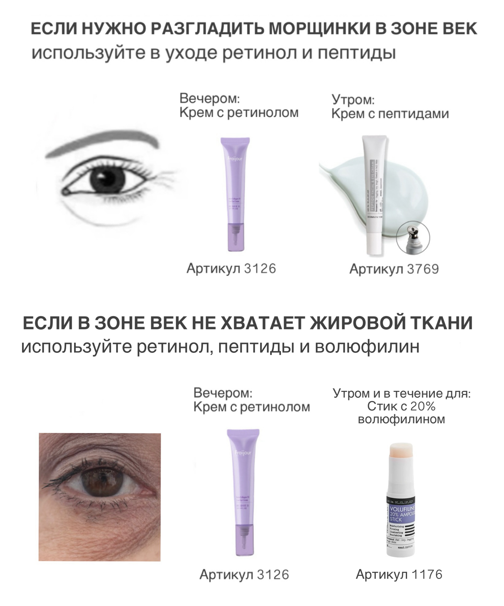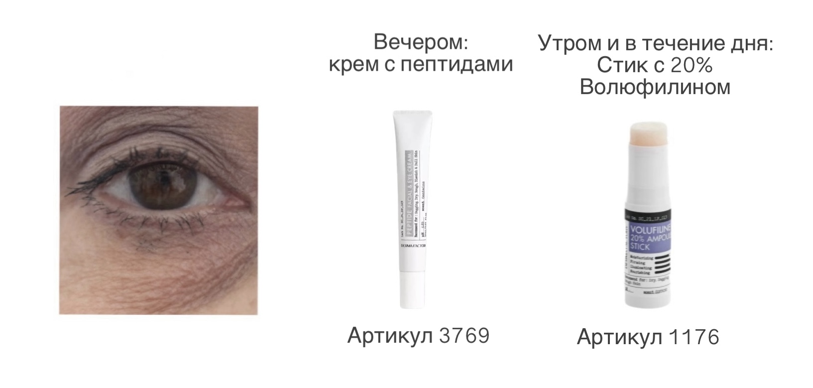 Также, если в зоне век кожа выглядит дряблой из-за потери подкожно-жировой клетчатки, используются средства с волюфилином.
