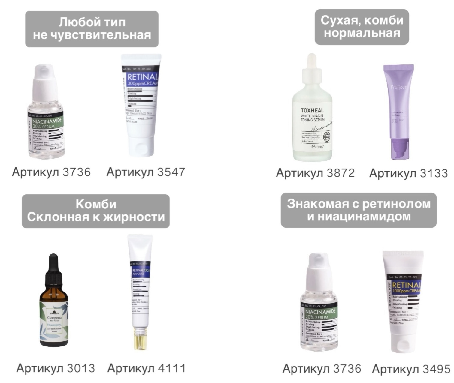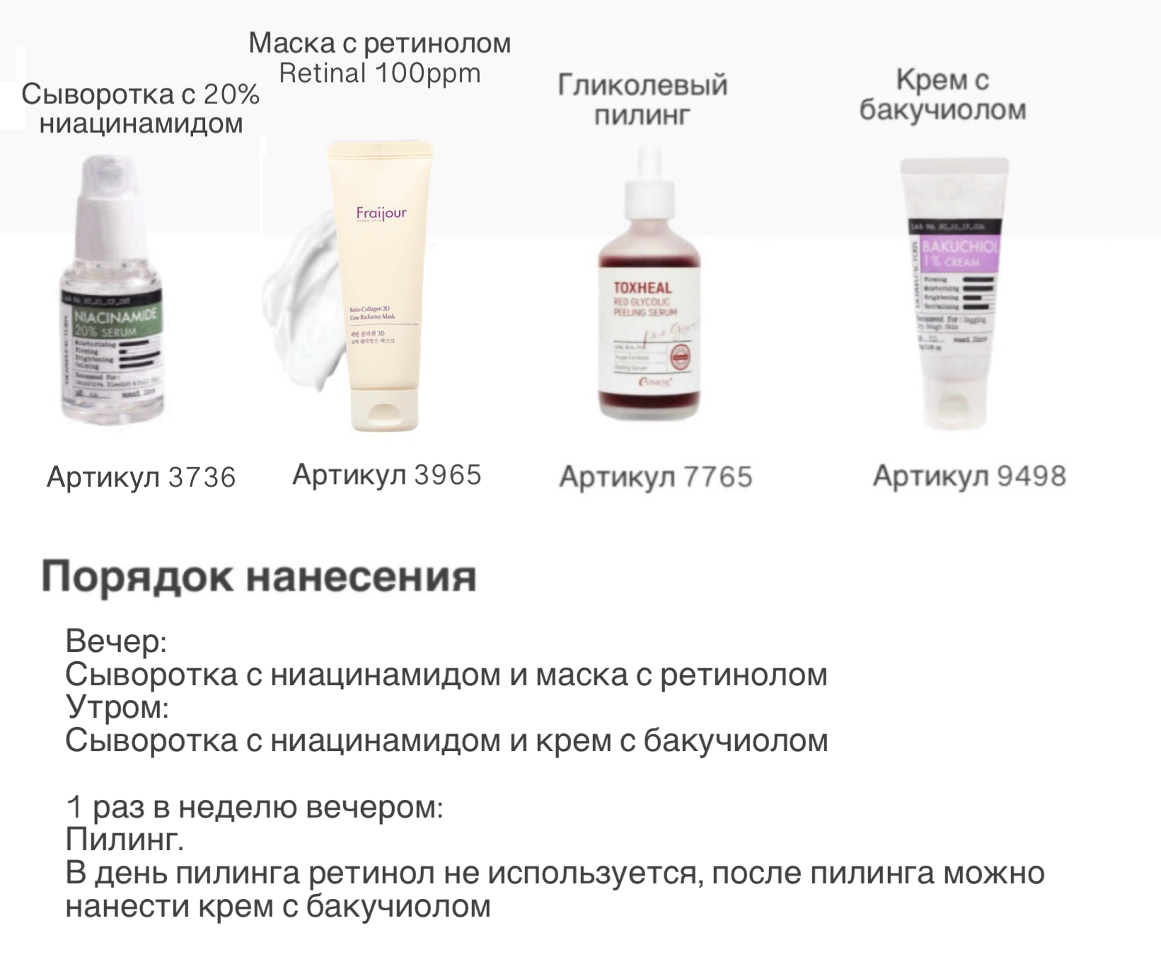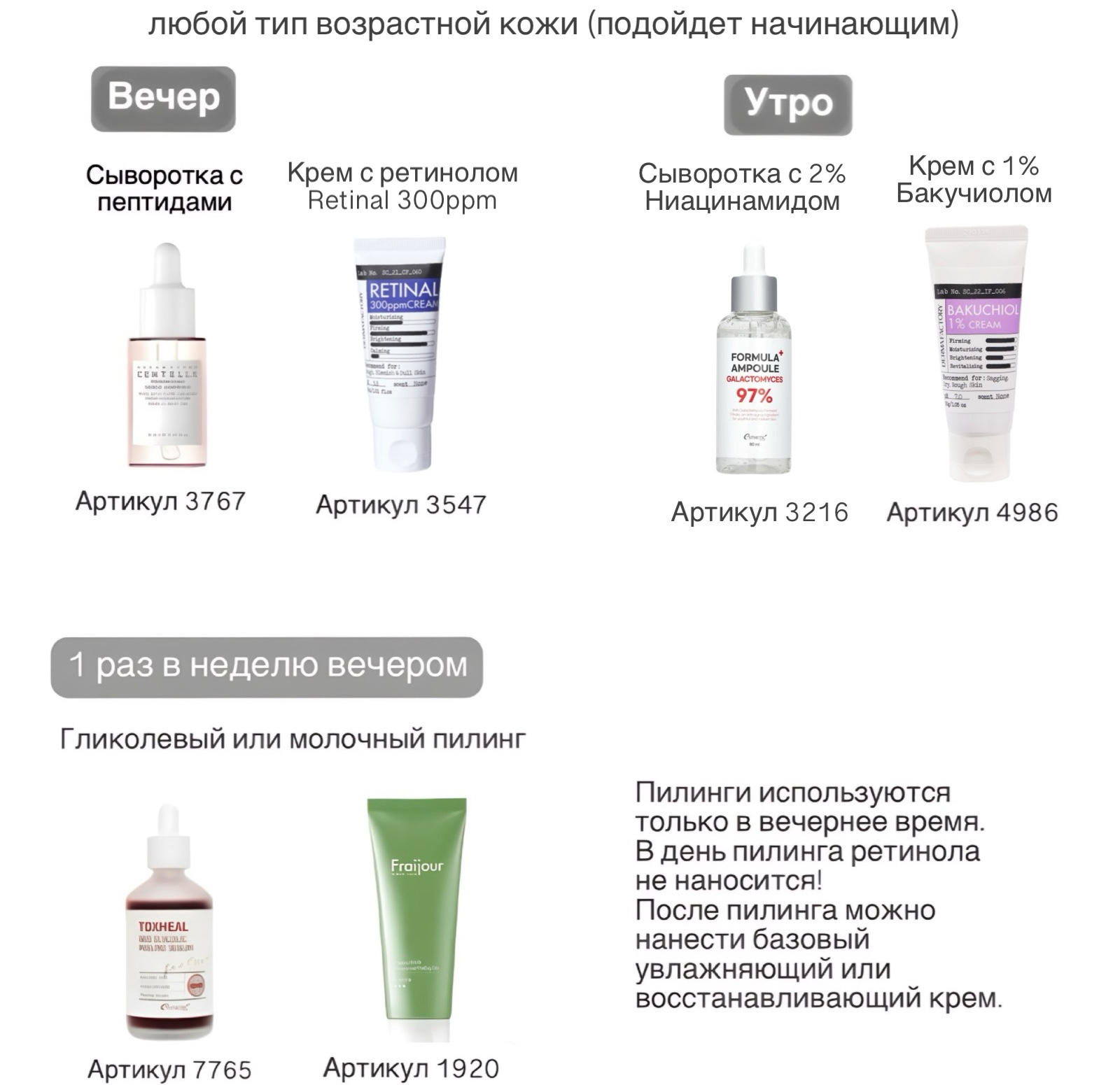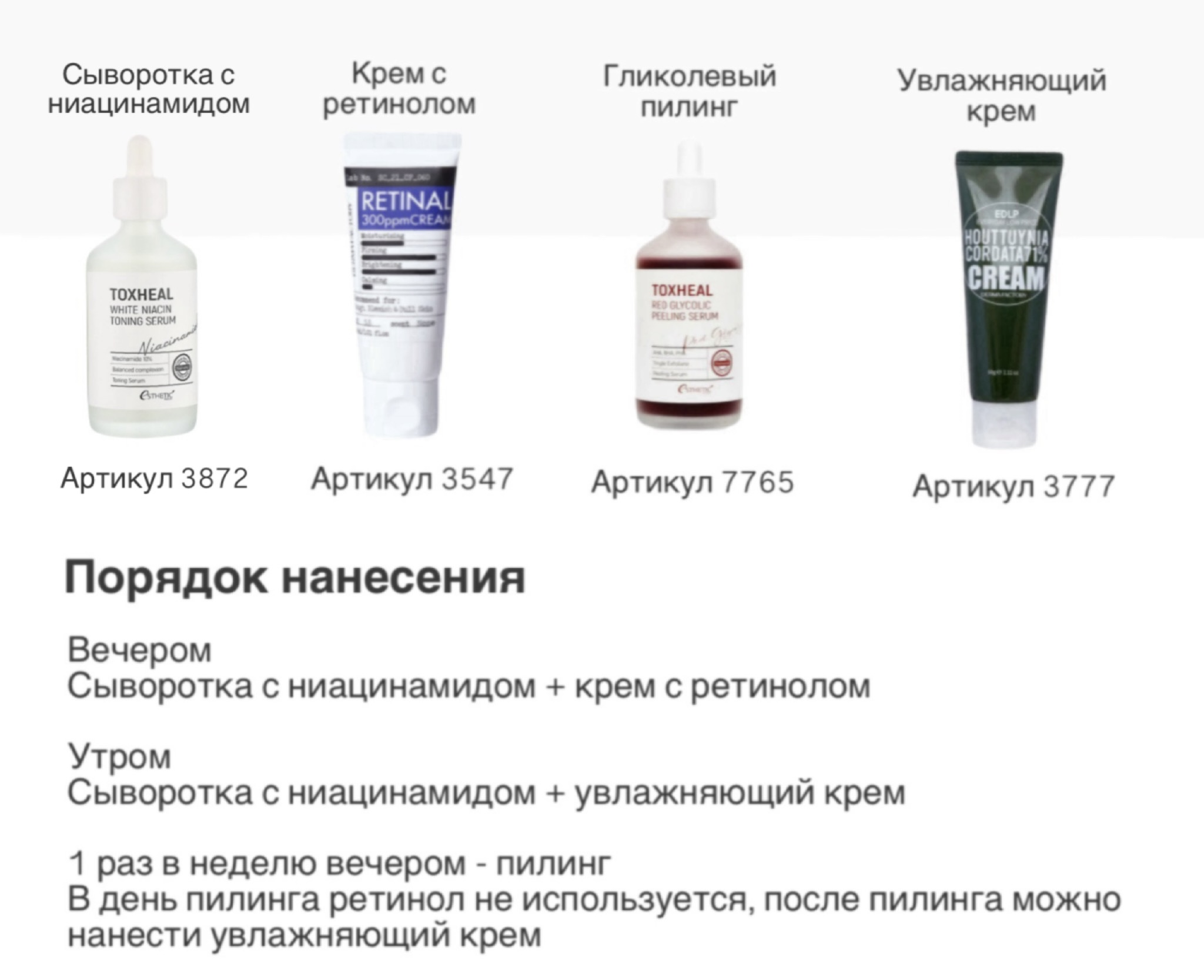 пример ухода для всех типов кожи, в том числе - не знакомой с ниацинамидом и ретинолом