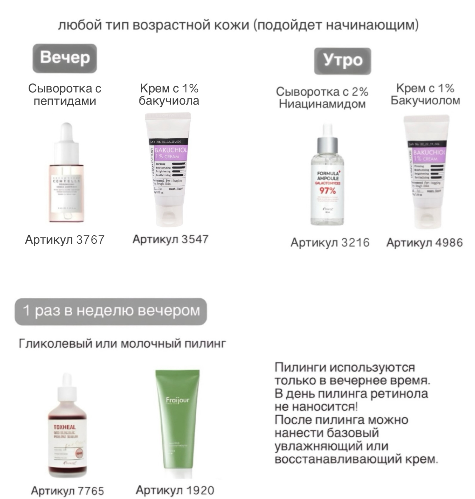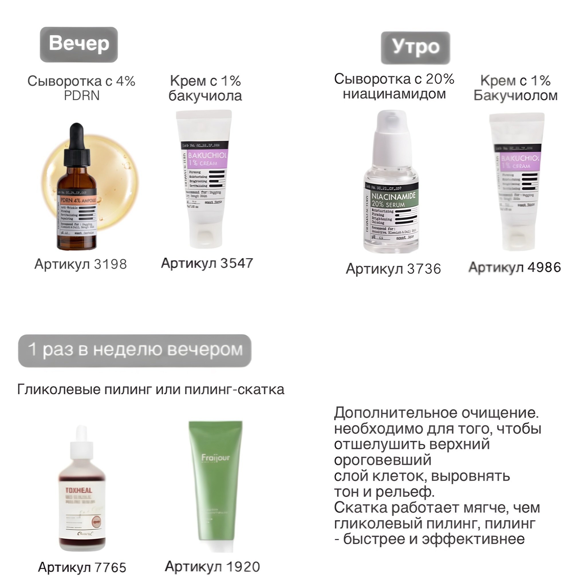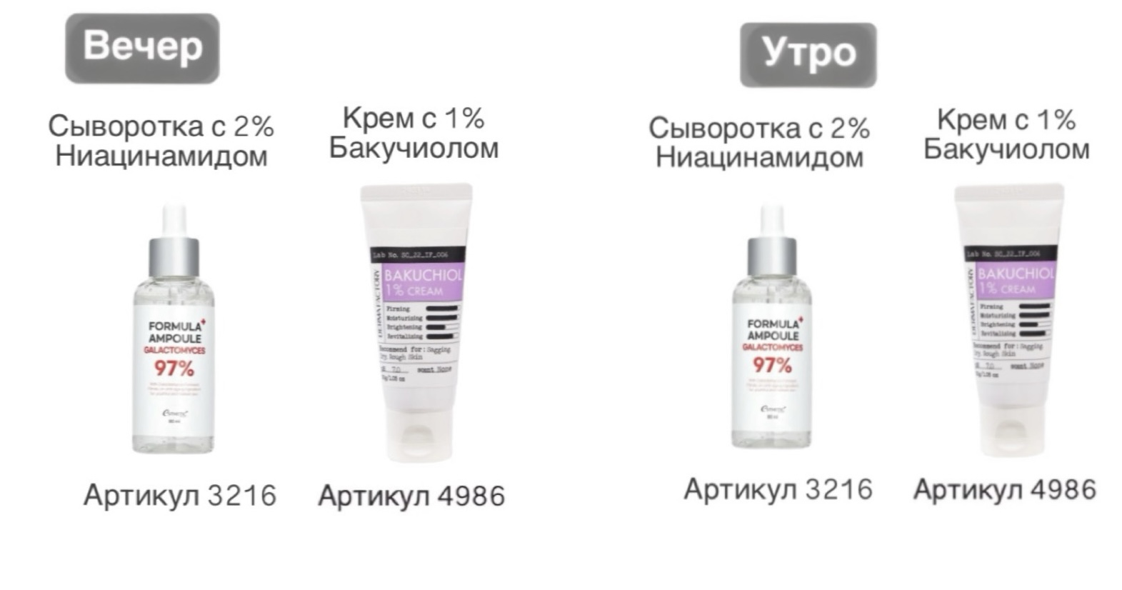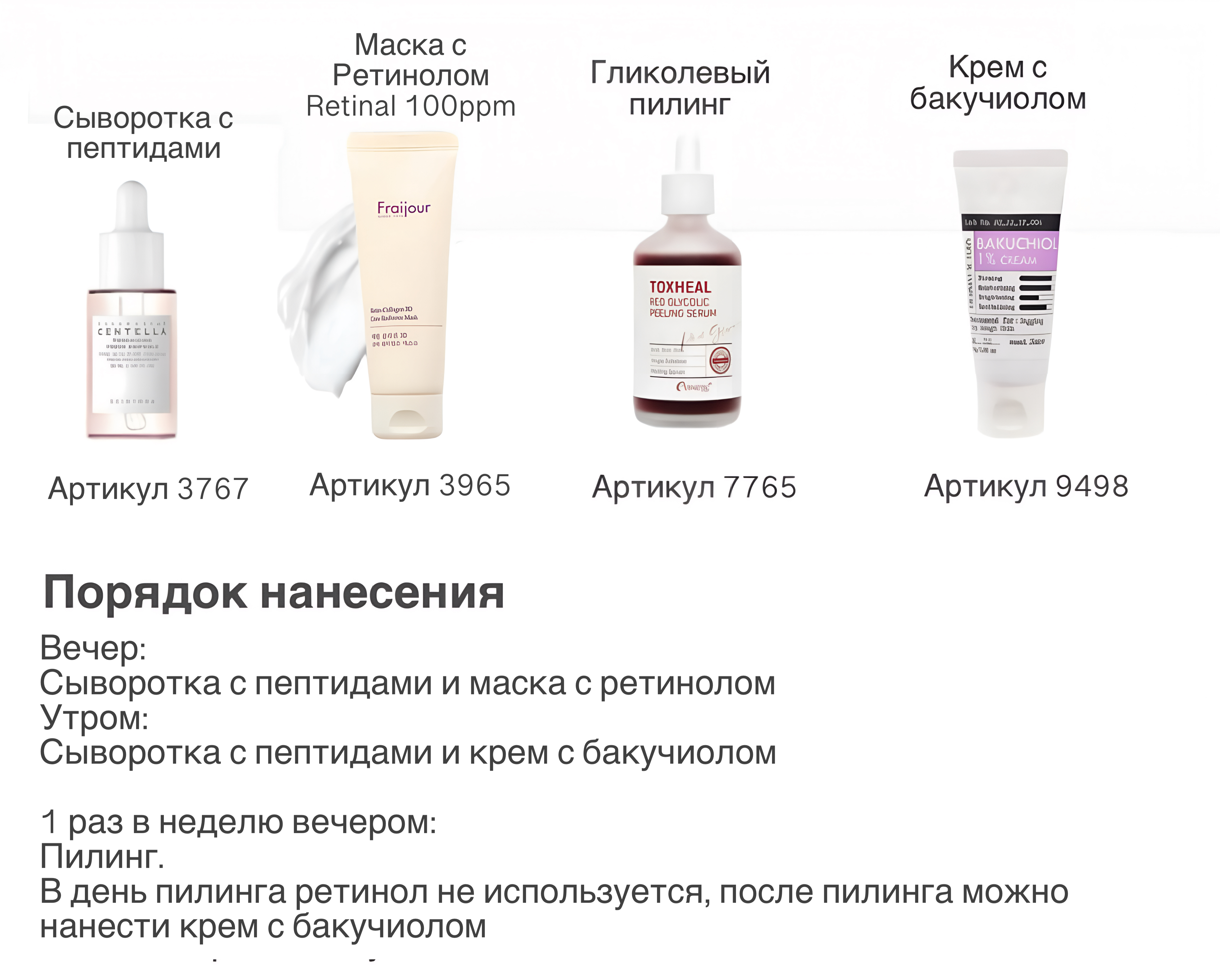 пример ухода для всех типов кожи, в том числе - не знакомой с ниацинамидом и ретинолом