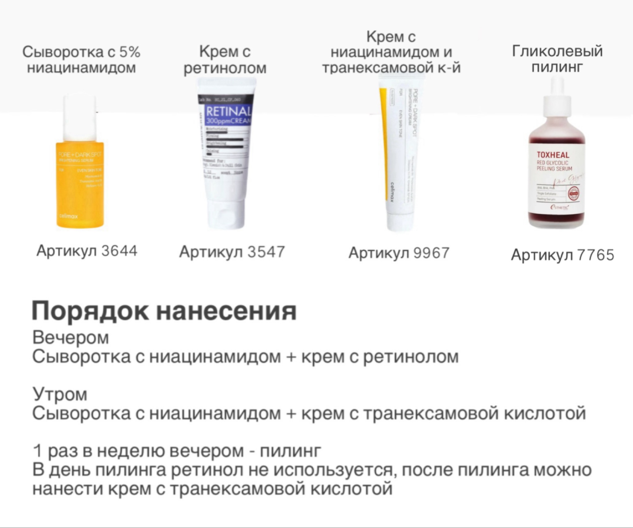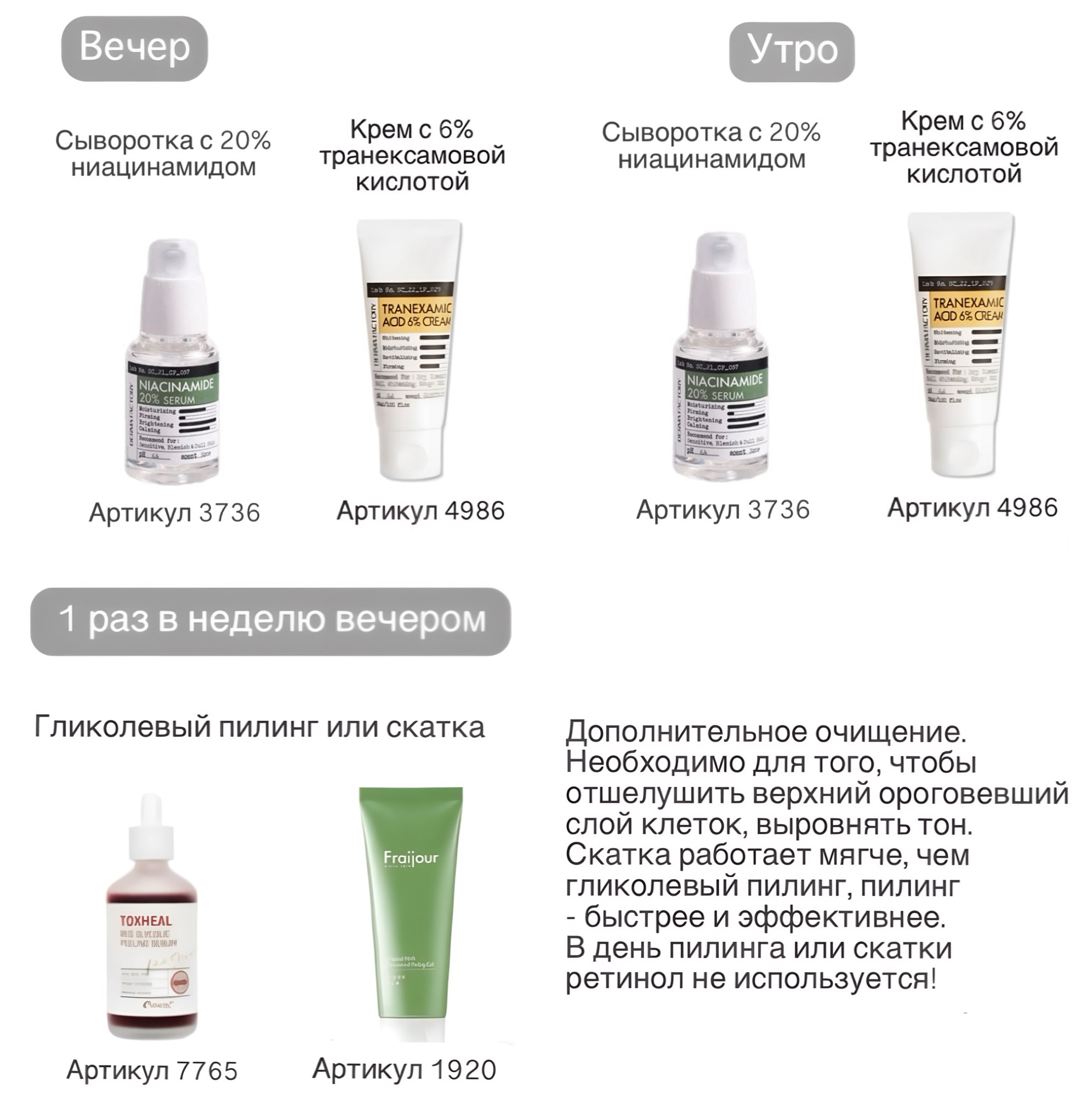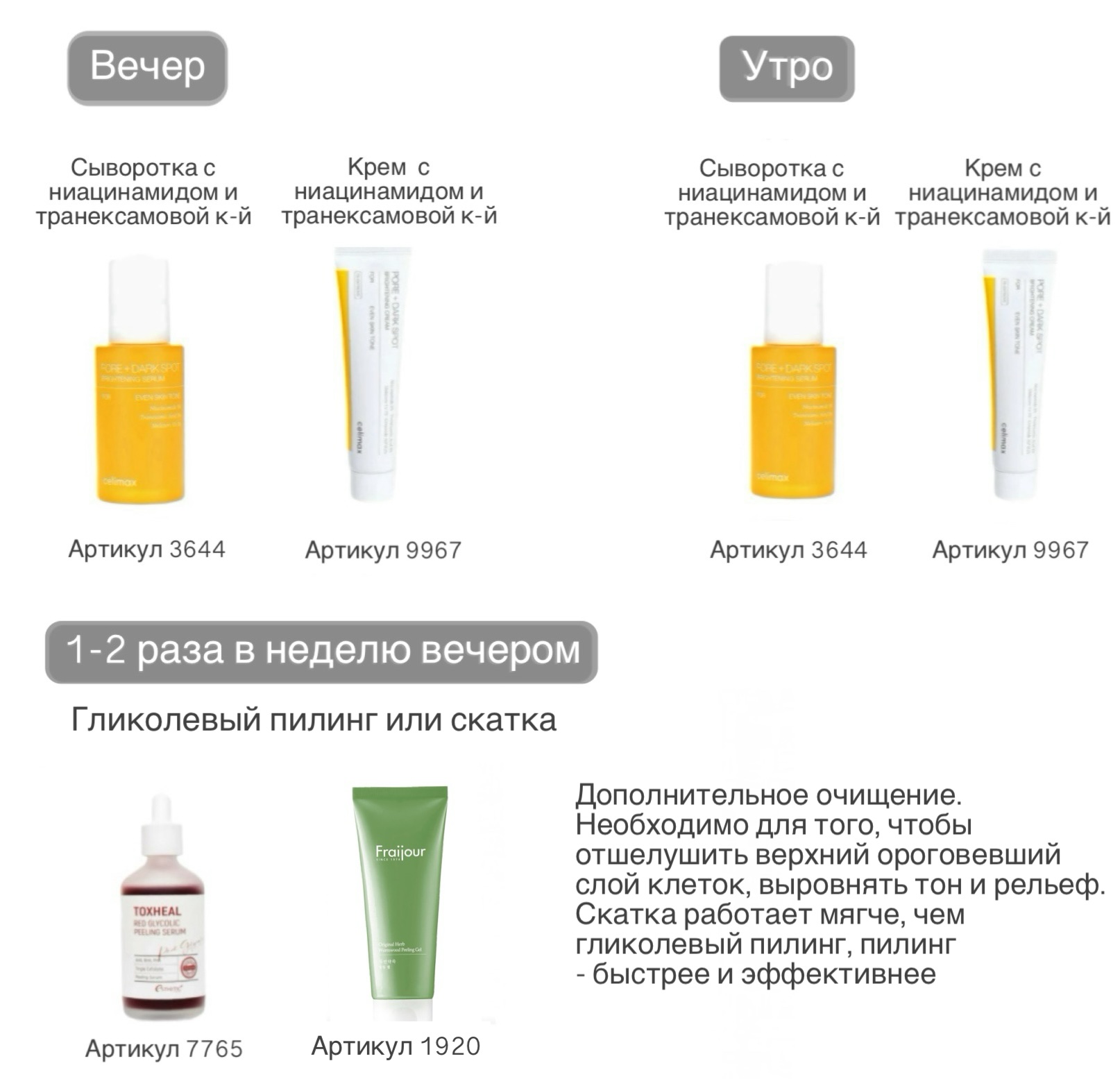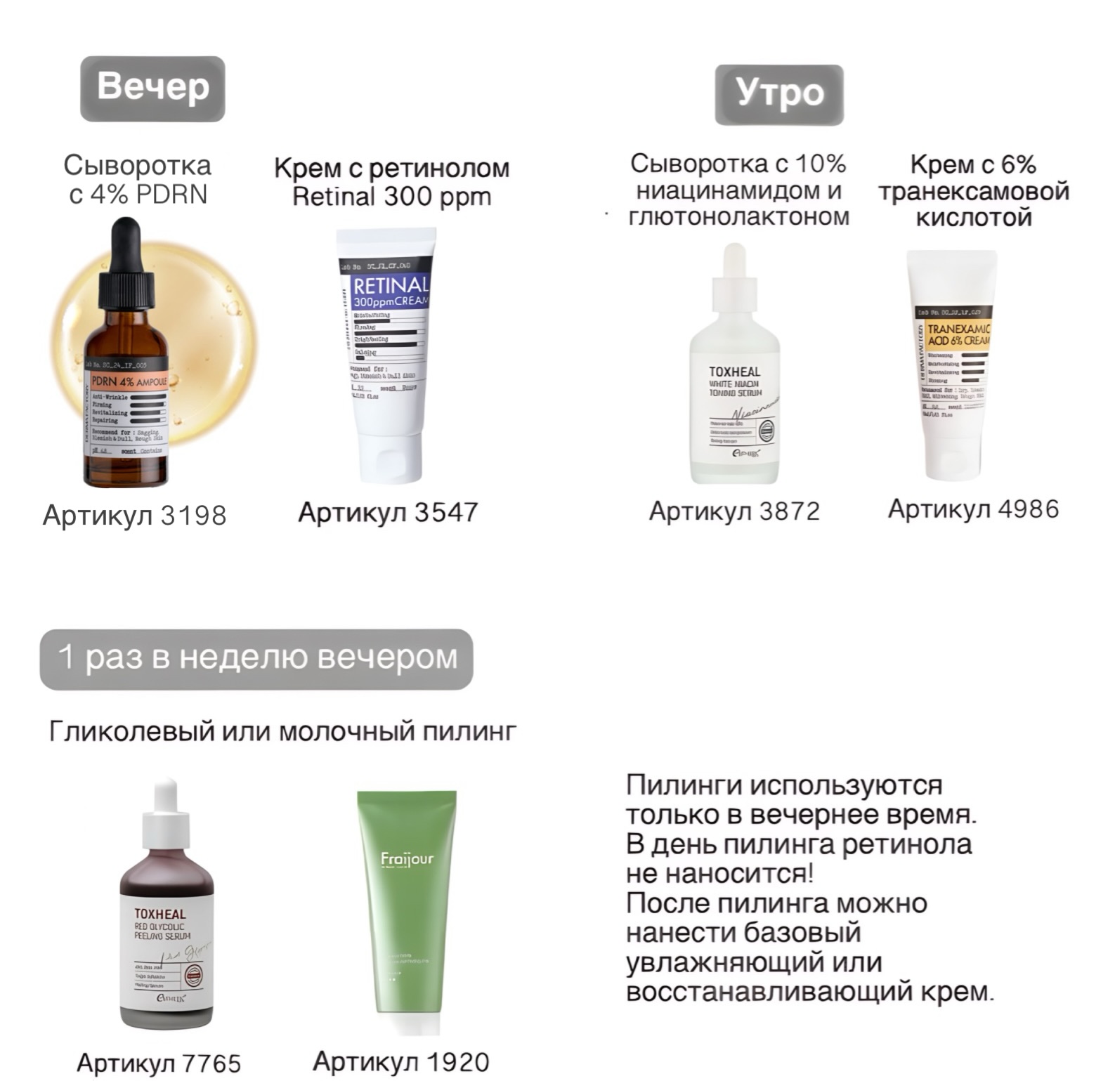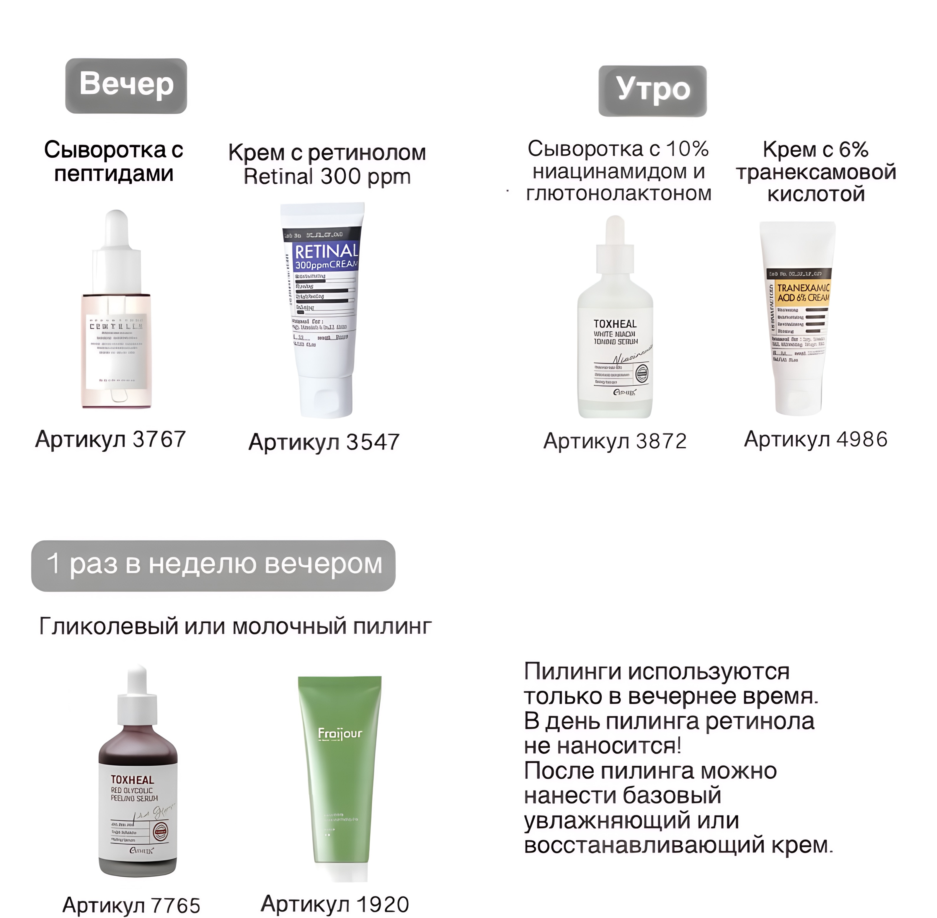 Например в УХОДЕ ПРОТИВ РАСШИРЕННЫХ ПОР И ПИГМЕНТАЦИИ можно вместо ретинола вечером наносить крем с транексамовой кислотой, а остальные активы оставить теми же.
