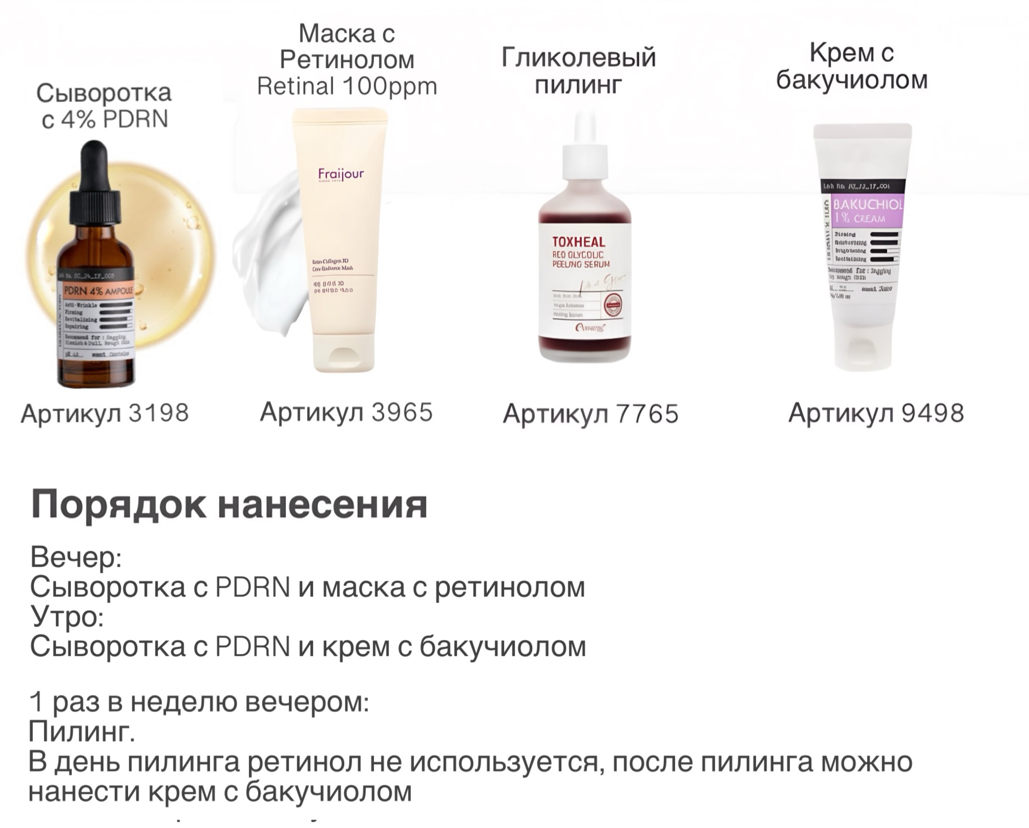 Также для ускорения регенерации клеток, улучшения рельефа и повышения эластичности кожи можно использовать сочетание PDRN, ретинола и ниацинамида: