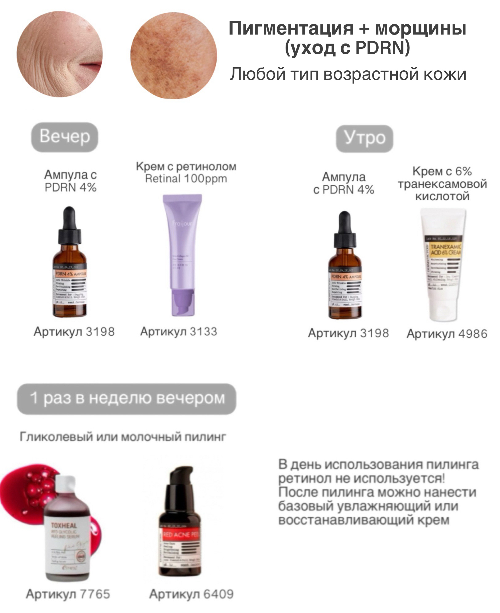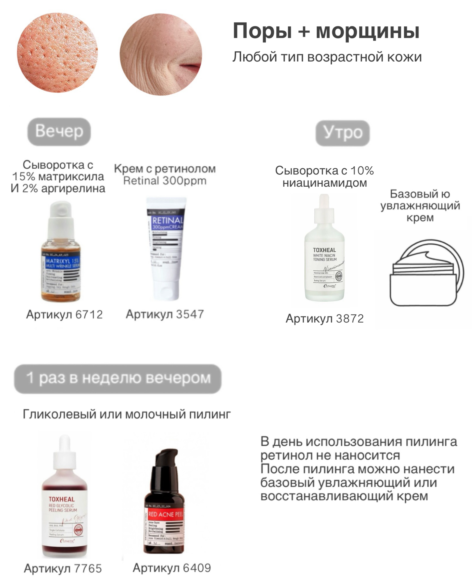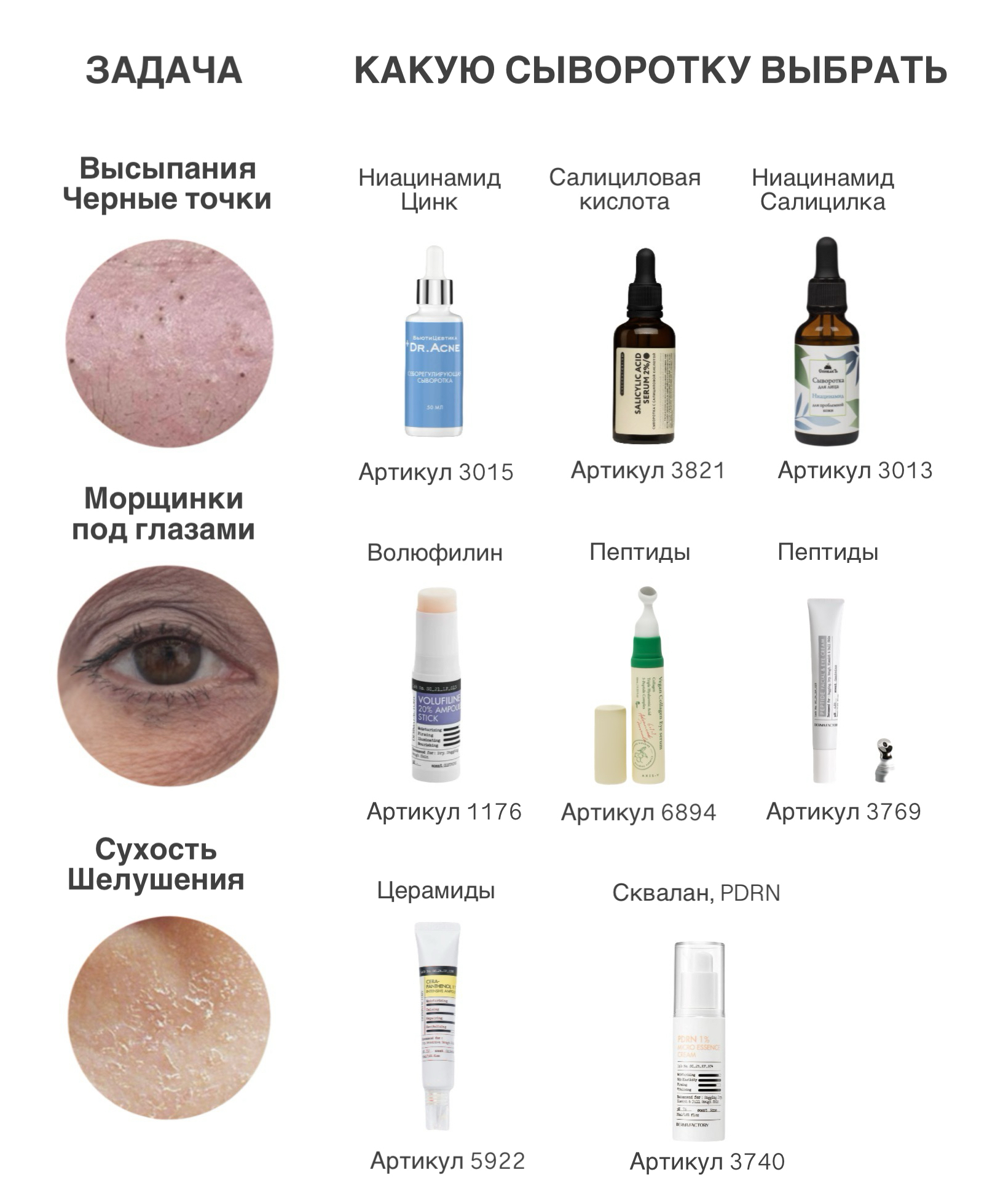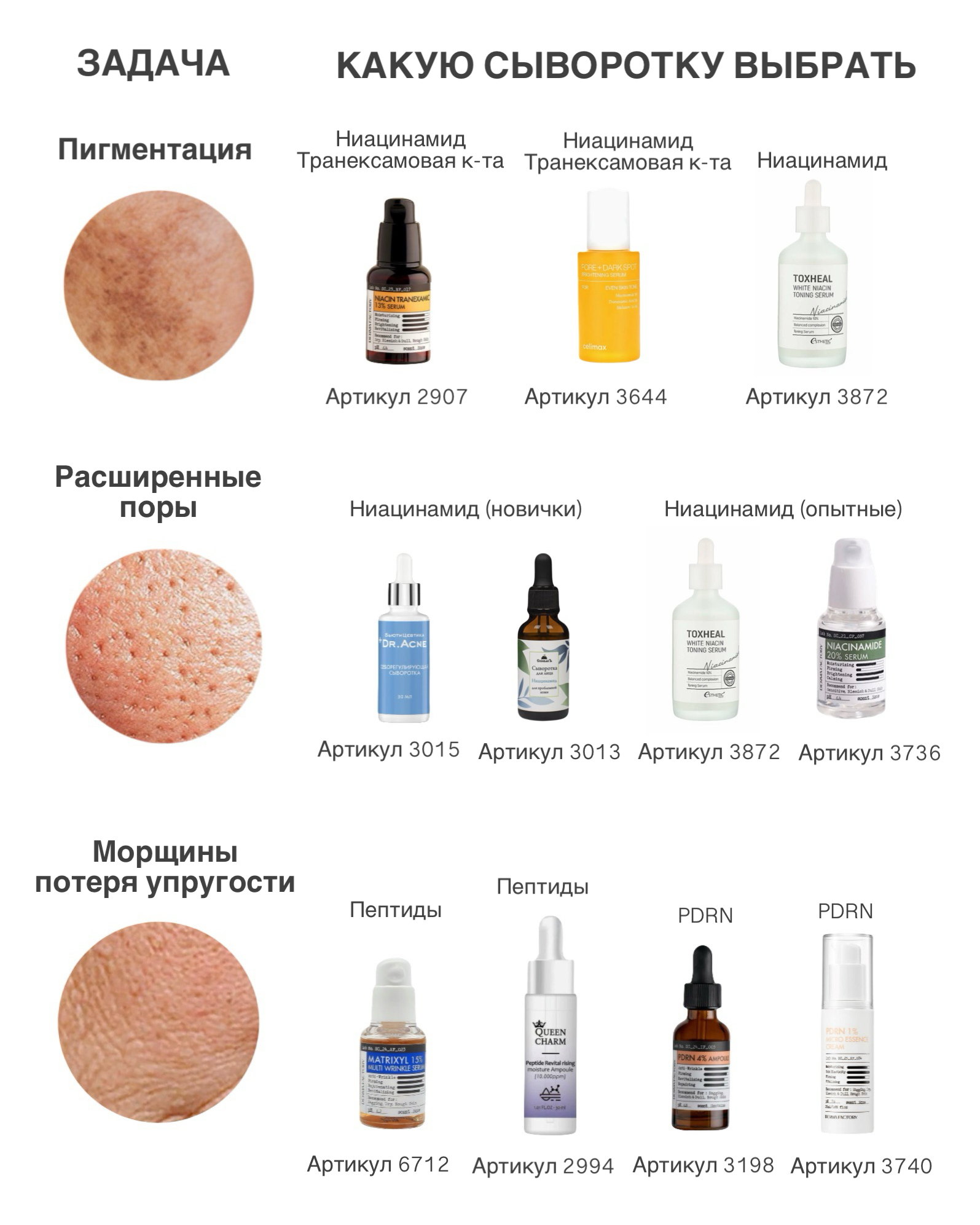 Иногда для решения какой-либо задачи достаточно всего одного такого продукта, поэтому мы подготовили подборку сывороток по проблеме, а также полные примеры ухода для разных типов кожи, целей и задач.