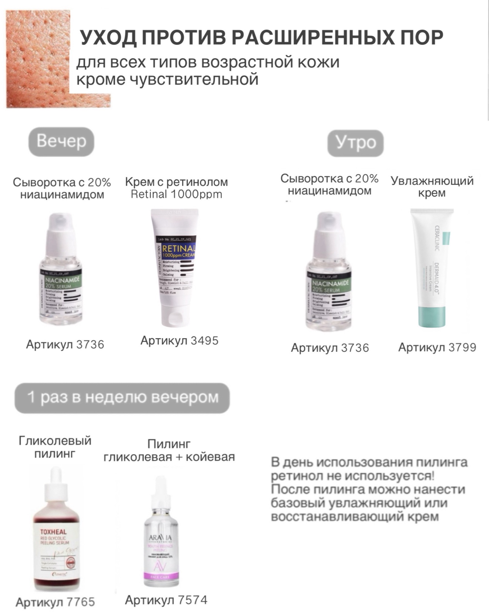 Также ретинол прекрасно сочетается с ниацинамидом, пептидами, волюфилином, транексамовой кислотой.